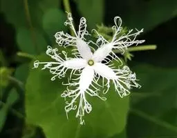 攀援藤本,长达10米;块根圆柱状,粗大肥厚,富含淀粉,淡黄褐色。茎较粗,多分枝,具纵棱及槽,被白色伸展柔毛。叶片纸质,轮廓近圆形,长宽均约5-20厘米,常3-5 (-7) 浅裂至中裂,稀深裂或不分裂而仅有不等大的粗齿,裂片菱状倒卵形、长圆形,先端钝,急尖,边缘常再浅裂,叶基心形,弯缺深2-4厘米,上表 栝楼花 面深绿色,粗糙,背面淡绿色,两面沿脉被长柔毛状硬毛,基出掌状脉5条,细脉网状;叶柄长3-10厘米,具纵条纹,被长柔毛。卷须3-7歧,被柔毛。花雌雄异株。雄总状花序单生,或与一单花并生,或在枝条上部者单生,总状花序长10-20厘米,粗壮,具纵棱与槽,被微柔毛,顶端有5-8花,单花花梗长约15厘米,花梗长约3毫米,小苞片倒卵形或阔卵形,长1.5-2.5 (-3) 厘米,宽1-2厘米,中上部具粗齿,基部具柄,被短柔毛;花萼筒筒状,长2-4厘米,顶端扩大,径约10毫米,中、下部径约5毫米,被短柔毛,裂片披针形,长10-15毫米,宽3-5毫米,全缘;花冠白色,裂片倒卵形,长20毫米,宽18毫米,顶端中央具1绿色尖头,两侧具丝状流苏,被柔毛;花药靠合,长约6毫米,径约4毫米,花丝分离,粗壮,被长柔毛。雌花单生,花梗长7.5厘米,被短柔毛;花萼筒圆筒形,长2.5厘米,径1.2厘米,裂片和花冠同雄花;子房椭圆形,绿色,长2厘米,径1厘米,花柱长2厘米,柱头3。果梗粗壮,长4-11厘米;果实椭圆形或圆形,长7-10.5厘米,成熟时黄褐色或橙黄色;种子卵状椭圆形,压扁,长11-16毫米,宽7-12毫米,淡黄褐色,近边缘处具棱线。花期5-8月,果期8-10月。