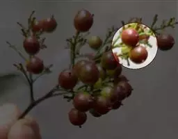 花绿黄色,两性,5基数,数个或10余个密集成近无总花梗或具短总花梗的腋生二歧聚伞花序,花梗长2-4毫米,被灰黄色绒毛;萼片卵状三角形,顶端尖,外面被毛;花瓣矩圆状匙形,基部具爪;雄蕊与花瓣近等长,花盘厚,肉质,10裂,中央凹陷,子房球形,无毛,2室,每室有1胚珠,花柱2浅裂或半裂。核果矩圆形或球形,长1-1.2厘米,直径约1厘米,橙色或红色,成熟时变黑色,基部有宿存的萼筒;果梗长5-8毫米,被短柔毛,2室,具1或2种子;中果皮薄,木栓质,内果皮厚,硬革质;种子宽而扁,长6-7毫米,宽5-6毫米,红褐色,有光泽。花期8-11月,果期9-12月。