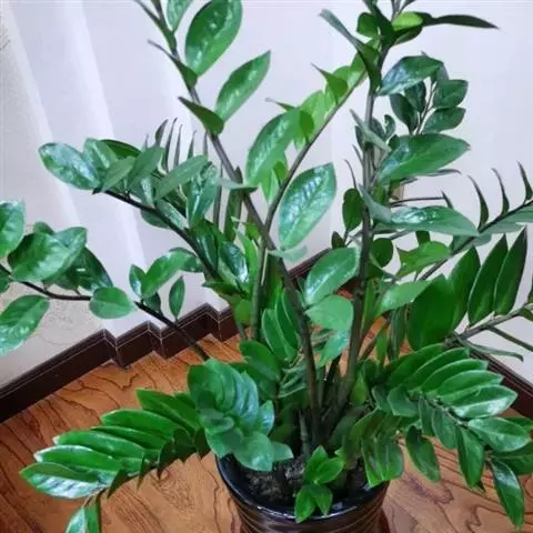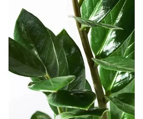 雪铁芋植株的每一枚偶数羽状复叶都呈叶轴基部硕壮的状态,仿佛是挺起的佛肚。叶轴的中上部则呈圆柱形,上有不规则的暗褐色斑纹,宛若外被一层迷彩衣。其复叶上的椭圆形或卵圆形小叶,质地厚实,叶色浓绿,在阳光下仿佛涂上一层闪闪发光的釉彩。如果将数株合栽于一个精致的青花瓷盆中,则有一种蓬勃向上的生机、葱翠欲滴的活力,观赏价值高。