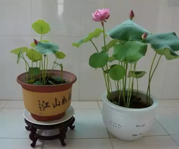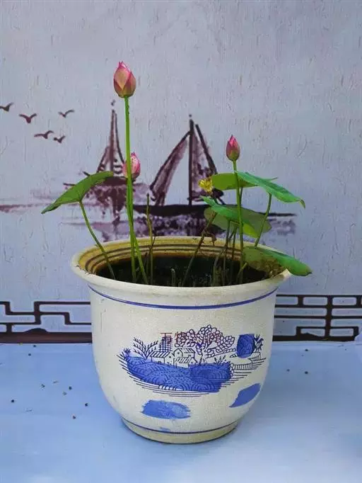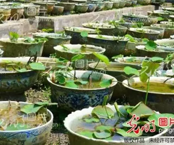 4、芽苗移栽:选口径45cm~75cm的无底孔陶盆或塑料花盆,盆内加半盆田园土或无化工污染的河塘泥,提前两周加水浸泡,不要施肥。移栽时将小荷苗的细根按入泥中,每盆栽一株,移栽后加适量水,以水不淹没小荷叶为度。