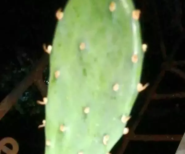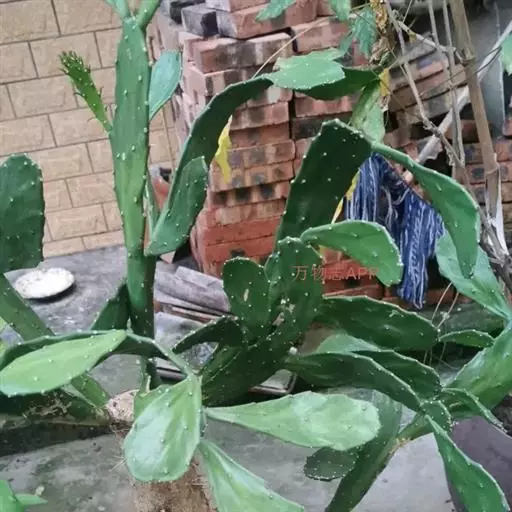 丛生肉质灌木,高(1-)1.5-3米。上部分枝宽倒卵形、倒卵状椭圆形或近圆形,长10-35(-40)厘米,宽7.5-20(-25)厘米,厚达1.2-2厘米,先端圆形,边缘通常不规则波状,基部楔形或渐狭,绿色至蓝绿色,无毛;小窠疏生,直径0.2-0.9厘米,明显突出,成长后刺常增粗并增多,每小窠具(1-)3-10(-20)根刺,密生短绵毛和倒刺刚毛;刺黄色,有淡褐色横纹,粗钻形,多少开展并内弯,基部扁,坚硬,长1.2-4(-6)厘米,宽1-1.5毫米;倒刺刚毛暗褐色,长2-5毫米,直立,多少宿存;短绵毛灰色,短于倒刺刚毛,宿存。叶钻形,长4-6毫米,绿色,早落。