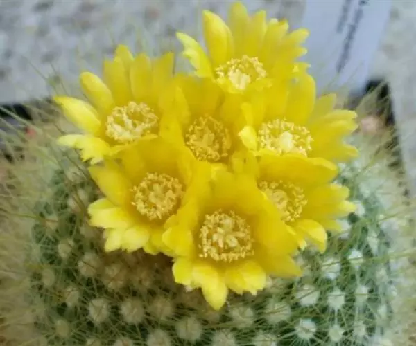 花辐状,直径5-6.5厘米;花托倒卵形,长3.3-3.5厘米,直径1.7-2.2厘米,顶端截形并凹陷,基部渐狭,绿色,疏生突出的小窠,小窠具短绵毛、倒刺刚毛和钻形刺;萼状花被片宽倒卵形至狭倒卵形,长10-25毫米,宽6-12毫米,先端急尖或圆形,具小尖头,黄色,具绿色中肋;瓣状花被片倒卵形或匙状倒卵形,长25-30毫米,宽12-23毫米,先端圆形、截形或微凹,边缘全缘或浅啮蚀状;花丝淡黄色,长9-11毫米;花药长约1.5毫米,黄色;花柱长11-18毫米,直径1.5-2毫米,淡黄色;柱头5,长4.5-5毫米,黄白色。