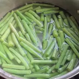 锅内做水,水开后,将豇豆放入,焯至色呈翠绿。