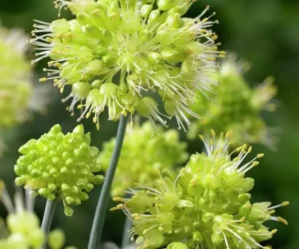 鳞茎狭卵状柱形至近圆柱状,粗1-2(-2.5)厘米;鳞茎外皮红褐色,薄革质,有光泽,条裂。叶圆柱状或半圆柱状,上面具沟槽,中空,比花葶短,粗1-2.5毫米。花葶圆柱状,实心,高30-80厘米,下部被叶鞘;总苞2裂,宿存;伞形花序球状,具多而密集的花;小花梗近等长,长7-20毫米,基部具小苞片;花淡黄色或白色;花被片卵状矩圆形,钝头,长4-5毫米,宽1.8-2.2毫米,外轮的略短;花丝等长,比花被片长1/4-1/2,锥形,无齿,基部合生并与花被片贴生;子房倒卵球状,长约2毫米,腹缝线基部具有短帘的凹陷蜜穴;花柱伸出花被外。花果期7-9月。