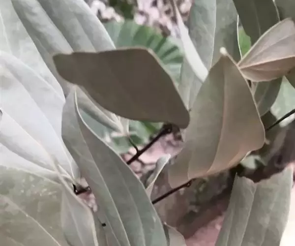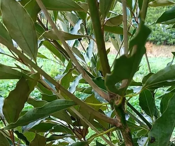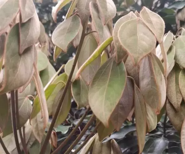 叶互生,椭圆形至披针状椭圆形,长6.6-20厘米,宽3-4.5厘米,两端渐狭,而先端钝,革质,幼叶两面密被金黄色绢毛,老叶上面毛脱落呈绿色而有光泽,下面粉绿,有贴伏黄褐或橙褐色绢毛,离基三出脉,侧脉每边4-5条,第一对侧脉离叶基部6-10毫米处发出,斜展,靠叶缘一侧有4-6条小支脉,先端弧曲联结,其余侧脉自中脉中部或中上部发出,中脉和侧脉在叶两面均突起,横脉两面明显;叶柄长2-3厘米,颇粗壮,初时密被金黄色丝状柔毛,后毛渐脱落变无毛。