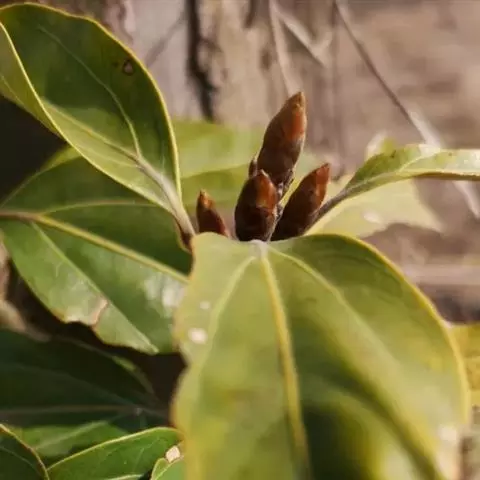 舟山新木姜子 乔木,高达10米,胸径达30厘米;树皮灰白色,平滑。嫩枝密被金黄色丝状柔毛,老枝紫褐色,无毛。顶芽圆卵形,鳞片外面密被金黄色丝状柔毛。