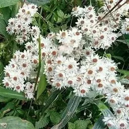 头状花序9-15个,在茎端密集成复伞房状;花序梗长1-3毫米。总苞宽钟状,长8-9稀11毫米,宽8-10毫米;总苞片4-5层,稍开展;外层卵圆形,长5-6毫米,红褐色或黑褐色;内层长圆披针形,长8-10毫米,宽3-4毫米,顶端尖,上部白色;最内层线形,有长约全长二至三分之一的爪部。花序托有繸状毛。雌株头状花序有多层雌花,中央有1-6个雄花;雄株头状花序全部有雄花。花冠长4.5-5毫米。冠毛较花冠稍长,雄花冠毛上部较粗扁,有锯齿。