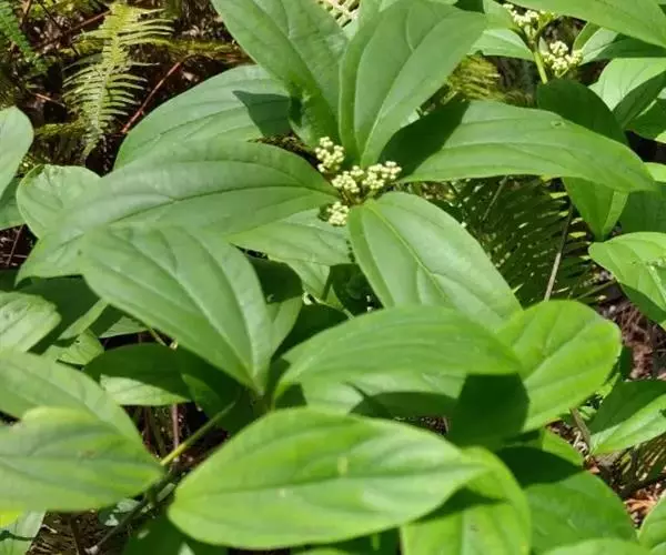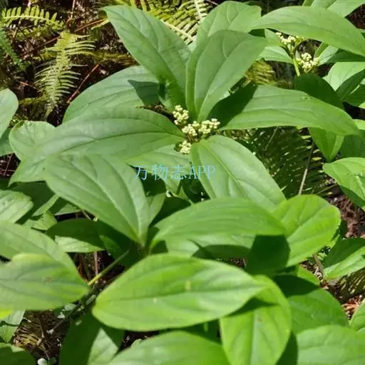 复伞形式聚伞花序顶生,无毛或近无毛,直径3-5厘米,有红褐色腺点,总花梗长不到1厘米,四角状,或几无,第一级辐射枝(4-)5条,中间者最短,花生于第三至第四级辐射枝上,有短梗或无梗;萼筒筒状倒圆锥形,长约1毫米,萼齿宽卵形,顶钝形,比萼筒短;花冠白色,辐状,直径约4毫米,长约2毫米,裂片近圆形,约与筒等长;雄蕊稍高出花冠,花药宽椭圆形;花柱稍高出萼齿。果实红色,卵圆形,长约8毫米;核扁圆形,腹面深凹陷,背面凸起,其形如杓,直径3-5毫米。花期5月,果熟期10-12月。