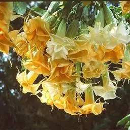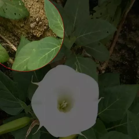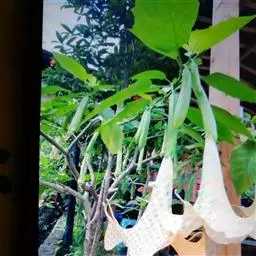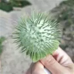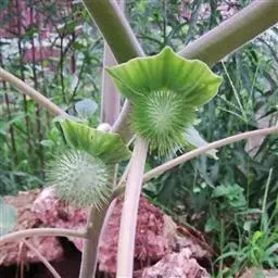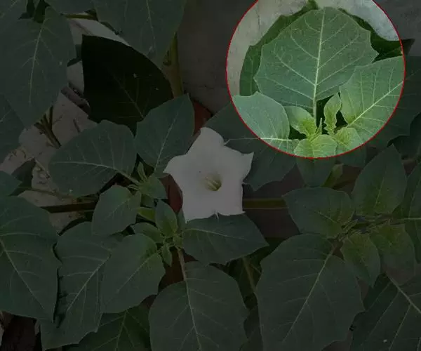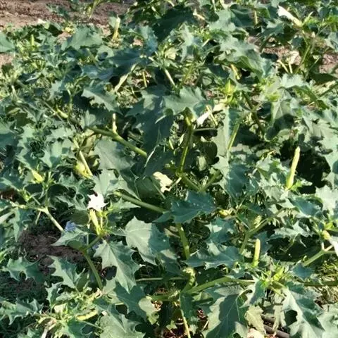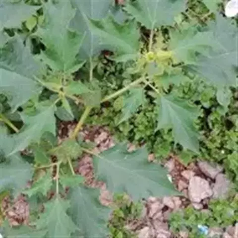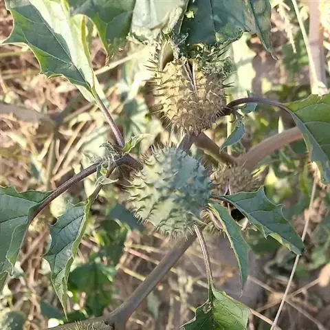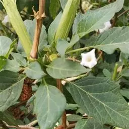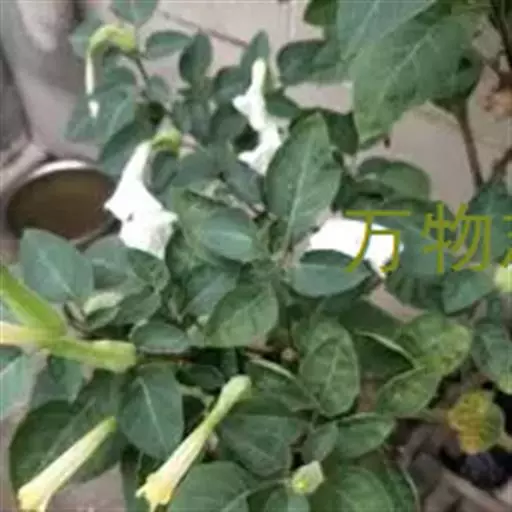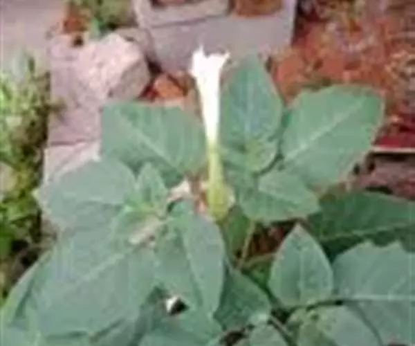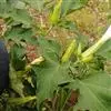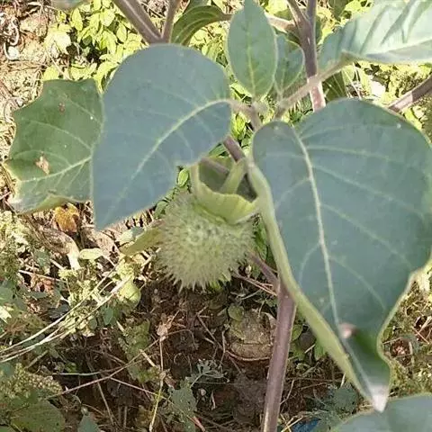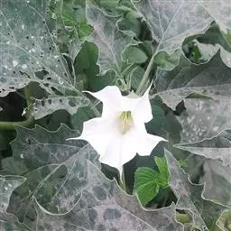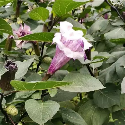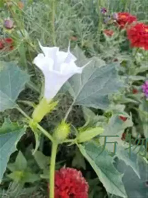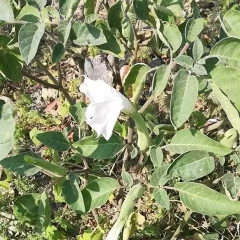 白花曼陀罗(学名:Datura metelL)是白花曼陀罗属植物,一年生草本植物,全株近于无毛。茎直立,圆柱形,高30~100cm,基部木质化,上部呈义状分枝。叶互生,上部的叶近于对生;叶柄长2~6cm,表面被疏短毛;叶片卵形、长卵形或心形,长8~14cm,宽6~9cm,先端渐尖或锐尖,基部不对称,全缘或具三角状短齿,两面无毛;叶脉背面隆起。花单生于叶胶或上部分枝间;花梗短,直立或斜伸,被白色短柔毛;花萼筒状,长4~6cm,淡黄绿色,称端5裂,裂片三角形,先端尖。功效:清火解毒,消肿止痛,杀虫止痒。