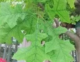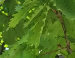 落叶乔木,高达25米,树皮暗灰褐色,深纵裂。小枝粗壮,有沟槽,密被灰黄色星状绒毛。芽 槲树 宽卵形,密被黄褐色绒毛。叶片倒卵形或长倒卵形,长10-30厘米,宽6-20厘米,顶端短钝尖,叶面深绿色,基部耳形,叶缘波状裂片或粗锯齿,幼时被毛,后渐脱落,叶背面密被灰褐色星状绒毛,侧脉每边4-10条;托叶线状披针形,长1.5厘米;叶柄长2-5毫米,密被棕色绒毛。