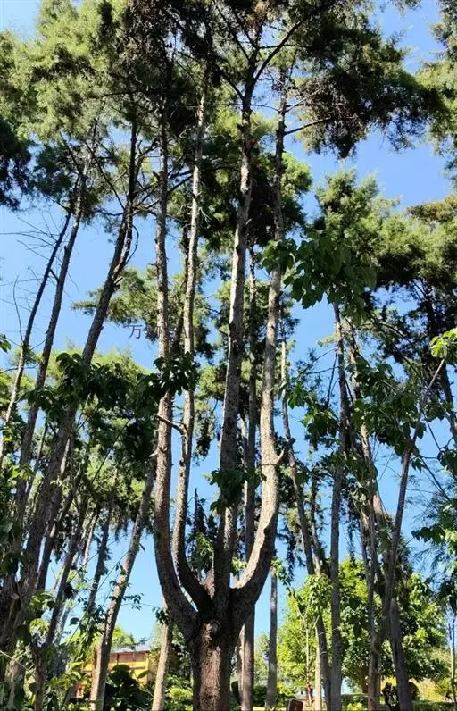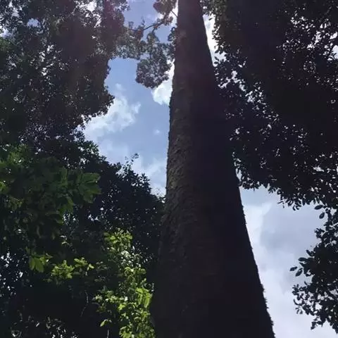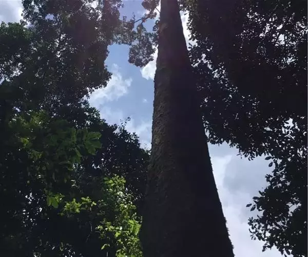 望天树是大乔木,高40(-60)米,胸径60-150厘米;树皮灰色或棕褐色,树干上部的为浅纵裂,下部呈块状剥落。幼枝被鳞片状的茸毛,具圆形皮孔。