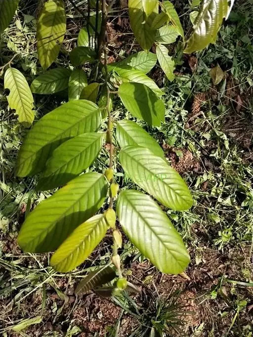 叶革质,椭圆形或椭圆状披针形,长6-20厘米,宽3-8厘米,先端渐尖,基部圆形,侧脉羽状,14-19对,在下面明显突起,网脉明显,被鳞片状毛或绒毛;叶柄长1-3厘米,密被毛;托叶纸质,早落,卵形,基部抱茎,具纵脉5-7条,被鳞片状毛或茸毛。