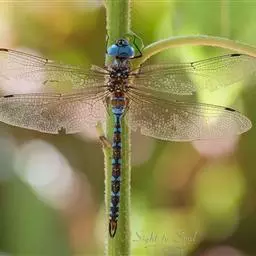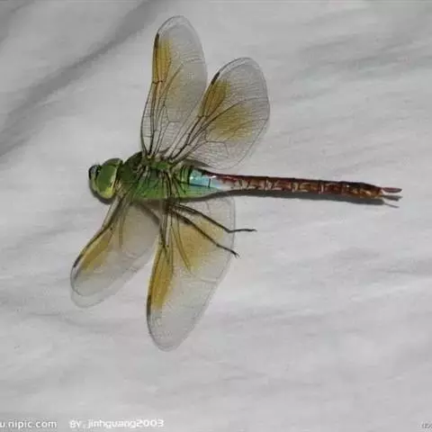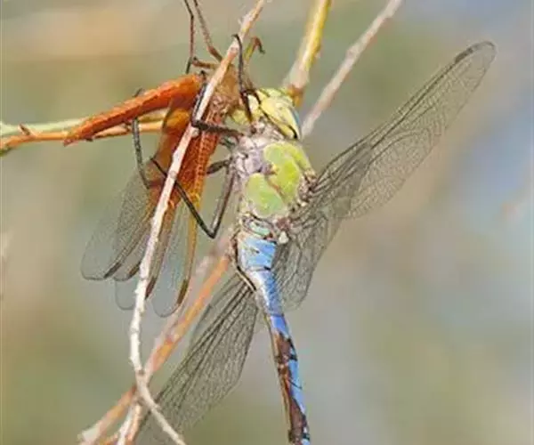 大型碧伟蜓 幼虫水虿入夏后,夜间顺着植物的茎干等爬出水面,然后渐渐羽化脱胎变成美丽的蜻蜓。这时它们的身体和翅膀湿润、柔软还无力飞行,待日光高照,晒干身体后便展翅腾飞,等到身体的颜色变得鲜艳【雄性腹部变得有性成熟的蓝色调】时才开始寻偶,一般都需要好几天,得看他的生命周期,一只蜻蜓生命中有百分之九十五以上的时间是从水里度过的。最后在空中交配,水面产卵。雌性的头是绿色,头顶是黄色透着蓝色和白色,身子是绿色,腹下有六条腿,大腿红色,小腿绿色,尾巴是红褐色透着白色条纹相间,根部俯瞰是绿色与腰一样粗,色彩丰富艳丽,层次分明,给人以强烈的美感;雄性比雌性颜色稍微深暗淡,没有比雄性漂亮,色彩不艳丽。但腹部膨大的两节雄性是蓝色的,这是雄性的显著特征。雄性羽化出水后在水边飞来飞去捕食,他们的领地意识很强,如有外来雄性侵入必驱赶之;雌性飞来便与之交配它们的强劲翅膀是蜻蜓之最,又宽又长,习惯在高空中长时间翱翔,盘旋,停留,能180度急转弯,垂直升空或降落,能悬停,也能倒着飞行,前后左右都可以。捕捉各种飞行中的小昆虫甚至白蝴蝶,边飞边吃,直立降落在树叶、草叶下方,隐蔽性很强,罕见降落。是全国各地乃至吉林地区常见的品种之一。 大型碧伟蜓与一般黄蜻对比图 即将羽化的终龄若虫