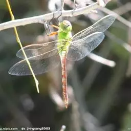 羽化过程的描述(此羽化过程适合所有蜻蜓的羽化,但是那种大团扇和小团扇春蜓有点差异,但是大同小异)蜻蜓羽化的时间要跟它的体型有关,体型越大,羽化的时间相对来说越长。但是所有蜻蜓羽化都要做准备热身活动,【有些则爬上水草不停地摇摆水草,像宴蜓那样子】,热身活动时间的长短也要根据蜻蜓的种类大小而定。刚开始爬出水面,寻找合适的羽化场所——水草,或者桥墩,石头等攀岩物。然后爬到攀岩物的顶端,【大部分都能爬上顶端,因为它要爬到足够的高度,以确保羽化时身体不会被下边的障碍物所阻挡,或者碰到水面,再加上它体力充沛,有时候爬到顶端还会在爬下来,来来回回爬上好几回】接着抓在水草好几个小时,这段时间就是给它腹部那几节也就是在水下没用的呼吸器官——腮左右两边的液体吸入胸腔,【这也就是为什么我们看到蜻蜓幼虫的腹部很大很短,胸部很小。而变成成虫时腹部则很瘦很长的样子了,因为水分被吸入胸腔了,胸部变大,腹部变短了。】当液体一旦吸入胸腔完成后,它的第三对足就十字交叉紧紧的抓住水草了。这个时候才是羽化的开始。接着液体被吸入胸腔使虫蛹膨胀直至破裂,渐渐一个色彩艳丽【绿色】的头部和胸部就会慢慢的出现,然后它头胸部往后靠也就是头的位置向下,反转180°了,这个过程要持续:大蜻蜓20分钟左右,小型则十分钟左右,要根据种类而定,【头朝下的时间】它要等它的六条腿充分的活动开,【此时液体在它的胸部和腹部的交界处流动着,有时候它的身体会抖动一下】身体慢慢的硬化,然后才再翻转180度,接着就把尾巴拔出来了。这个时候头部也是朝上的了,接着就可以把胸部的液体注入翅膀和腹部了,液体流入翅膀使翅膀充分展开需要一定的时间,这个时候翅脉还是透明白色的,然后要等翅膀的液体再被吸入体内,翅膀分开两边往往需要好一段时间,腹部伸直后翅膀也展开了。当翅膀的液体再流入体内时翅膀就变硬了,翅膀一旦展开就永远的不会再合上去了,整个过程需要好几个小时的时间,【胸腔的压力可以使液体流入翅膀,随后那些液体流入翅膀后才流进他的腹部】当翅膀展开后他的身体颜色还很浅,足还是浅色的,身体颜色还是很浅。那些颜色的的条纹还没有在身体外骨骼上形成,只是有点色素在慢慢的形成,直到第二天早上身体的颜色才会变成成虫的体色,雄性的颜色比雌性鲜艳,会闪光泽,刚羽化的它翅膀还是会反金属光泽,由于体型的根本性改变,蜻蜓成虫已经好几天不能够吃东西了。所以要等到两三天后才能进食。当过了好几天乃一段时间左右,它有了性成熟身体的颜色也变得很鲜艳。羽化时有两对白色的线体就是它在水下没用的呼吸器官。当他的呼吸器官与它身体脱离的时候,这样子它就可以在空中用外骨骼呼吸了。