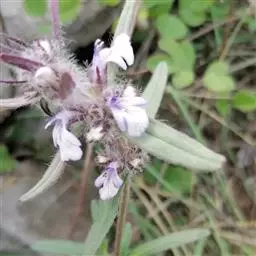 花长年零星开放,盛花期4~5月。一年或二年生草本,高10~30cm,全株被白色长柔毛。茎方形,基部匍匐。叶对生,匙形或倒卵状披针形,长3~11cm,宽0.8~3cm,边缘有不规则波状粗齿;叶柄具狭翅。轮伞花序有6~10朵花,排成间断的假穗状花序;苞片叶状,花萼钟形,5齿裂;花冠唇形,淡蓝色、