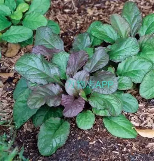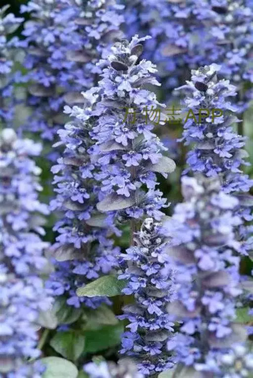 多年生常绿草本。铺地状。茎多而蔓生。叶丛莲座状,叶小,具光泽,深古铜紫色。穗状花序短,花蓝色,春季开放 。