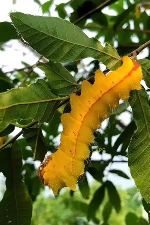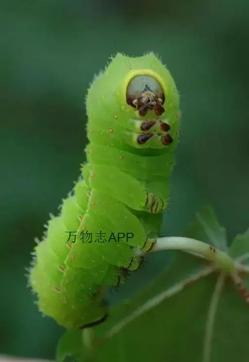 幼虫由头、胸、腹三部分组成。外观为粗壮的 幼虫 长桶形,由13个体节组成,其中胸部3个体节,腹部10个。每一胸节腹面有1对胸足,腹部第3~6节及第10节每节腹面各有1对腹足。第1胸节及第1~8腹节每节两侧各有l对气门。第2、3胸节之间有1对退化气门。除蚁蚕体色为黑色外,其他龄期体色因品种不同而异。体表生有多种突起和刚毛。柞蚕幼虫的头部为半圆形骨质构造,由触角、单眼、口器及吐丝器组成。触角主要用来感受机械刺激,单眼是幼虫的视觉器官,口器用于咀嚼柞树叶,吐丝器在蚕近于5龄期时孔口近半圆形以进行吐丝。胸部以颈膜于头部相连,由前、中、后依次增大的3个胸节组成。各胸节腹面均有1对胸足,从前到后依次增大。胸足略呈锥形,有了胸足,食叶、吐丝及爬行均方便。腹部与胸部相连,共有10节组成。第3~6腹节及第1腹节腹面各有腹足1对,腹足主要用来爬行和抓捉物体用。气门位于第1胸节及第1~8腹节两侧,共9对。气门是用来交换气体的门户,气门与内部的气管丛、纵横气管及各级分支气管构成气管系统。