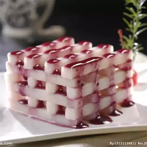 7、最后将山药泥按个人喜好整出形状,淋上蓝莓酱即可。