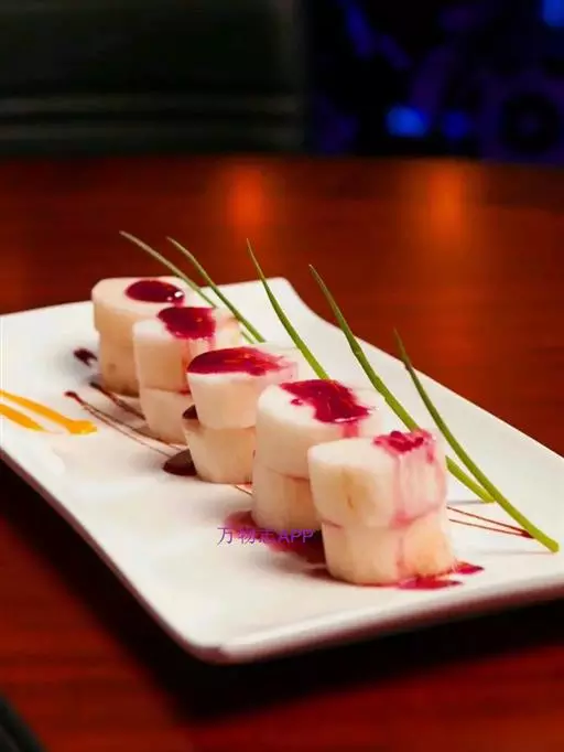 4、将经浸泡的山药条按照自己喜欢的方式摆在盘中,用适量得蓝莓酱淋在山药条上即可。