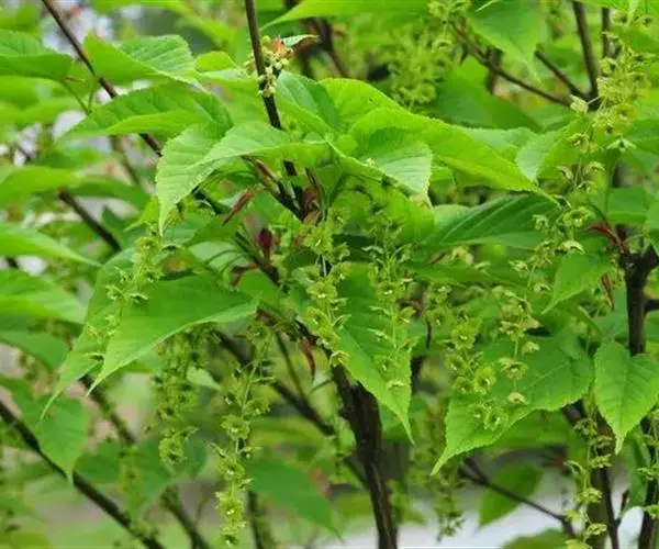 穗状花序,下垂,长7-9厘米,有短柔毛,常由2-3年无叶的小枝旁边生出,稀由小枝顶端生出,近于无花梗,花序下无叶稀有叶,花淡绿色,单性,雄花与雌花异株;萼片5,卵形,长1.5毫米,宽1毫米;花瓣5,短小或不发育;雄花有雄蕊4-6,通常5,长约2毫米;花盘微发育;雌花的子房无毛,花柱短,柱头反卷。