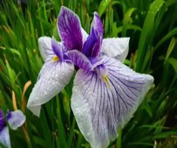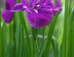 花菖蒲(学名:Iris ensata var. hortensis Makino et Nemoto):是玉蝉花的变种。多年生宿根挺水型水生花卉。根状茎短而粗,须根多并有纤维状枯叶梢,叶基生,线形,叶中脉凸起,两侧脉较平整。花葶直立并伴有退化叶1-3枚。花大直径可达15厘米。外轮三片花瓣呈椭圆形至倒卵形,中部有黄斑和紫纹,立瓣狭倒披针形。花柱分枝三条,花瓣状,顶端二裂。蒴果长圆形,有棱,种皮褐黑色。花期6-7月,果期8-9月。以日本栽培最盛,己育出一百多个品种。