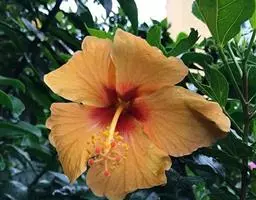 一年生或二年生草本、高1-2米、被粗毛。叶通常掌状5-7深裂,直径6-15厘米, 黄葵 裂片披针形至三角形,边缘具不规则锯齿,偶有浅裂似械叶状,基部心形,两面均疏被硬毛;叶柄长7-15厘米,疏被硬毛;托叶线形,长7-8毫米。花单生于叶腋间,花梗长2-3厘米,被倒硬毛;小苞片8-10,线形,长10-13毫米;花萼佛焰苞状,长2-3厘米,5裂,常早落;花黄色,内面基部暗紫色,直径7-12厘米;雄蕊柱长约2.5厘米,平滑无毛;花柱分枝5,柱头盘状。蒴果长圆形,长5-6厘米,顶端尖,被黄色长硬毛;种子肾形,具腺状脉纹,具香味。花期6-10月。