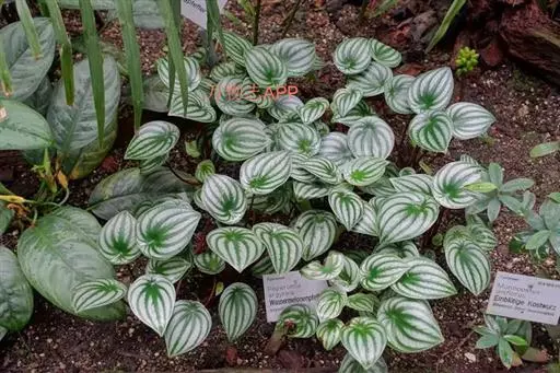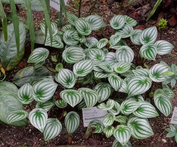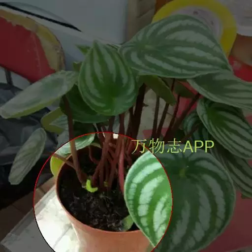 多年常绿草木,株高约15-20厘米。根茎顶端从生状抽生长长的叶柄,红褐色的叶柄上端着生单叶。叶片卵圆形至心脏形,向叶柄内反卷成半圆形,主宽脉八条,由中央向四周呈辐射状延伸,宽脉绿色,脉间银白色,叶形和色泽颇似西瓜。穗状花序,花小,白色。 西瓜皮椒草