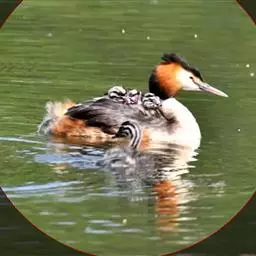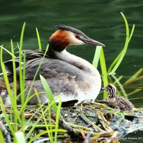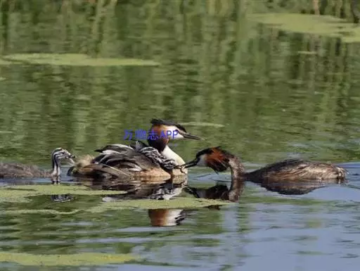 凤头鸊鷉(学名:Podiceps cristatus):体长为50厘米以上,体重为0.5-1千克。前额和头顶部黑褐色,枕部两侧的羽毛往后延伸,分别形成束羽冠。脚的位置几乎处于身体末端,尾羽短而不显,趾侧有瓣蹼。瓣蹼十分发达,除了适于游水之外,在陆地上几乎是寸步难移的。