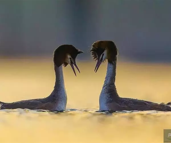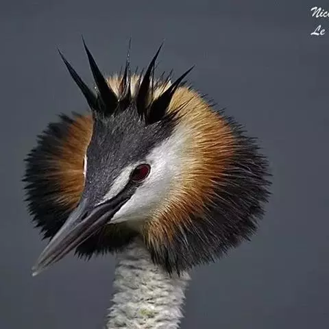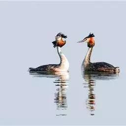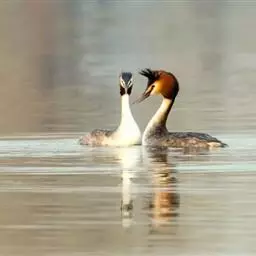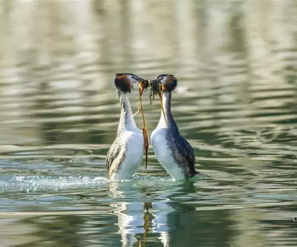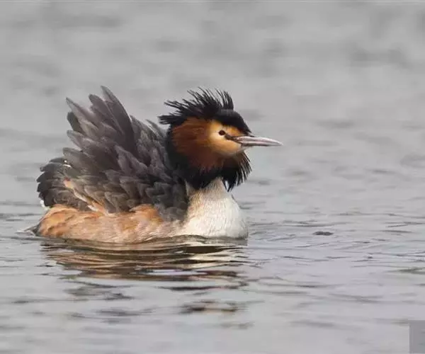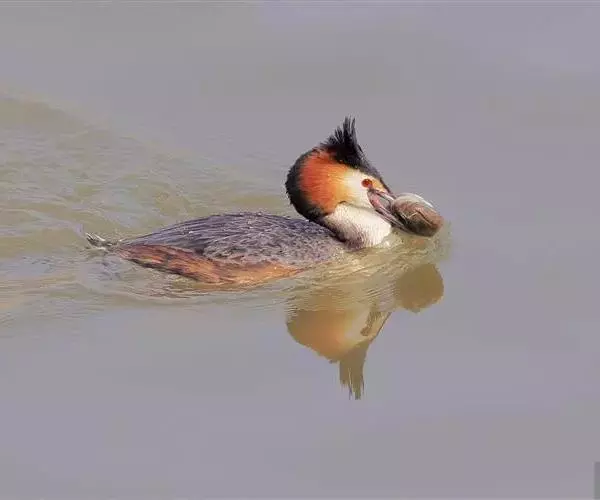 凤头鸊鷉是一种游禽。也是体形最大的一种鸊鷉,雄鸟和雌鸟比较相似,有鸭子一样大小,嘴又长又尖,从嘴角到眼睛还长着一条黑线。它的脖子很长,向上方直立着,通常与水面保持垂直的姿势。