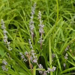 玉龙草,具有块根,根系发达,根长可及20公分以上,乳白色略粗,几无茎,植株矮小,簇生成半球团状,高约10公分。 单叶,丛生,叶片长10~20公分,宽0.2~0.3公分,狭线形,叶基锐,叶尖钝,叶缘粗糙,墨绿色,上下表面光滑,下表面多少带白粉状,脉5~7条。 总状花序,每苞花10朵,花茎直立,淡紫色至白色。 蒴果,径约0.5公分,种子深蓝色。生长及分生迅速,栽植地面可迅速长成一片浓密加地毡状的草皮,对水土保持有特别优良之效果。耐阴性强、且较一般草皮耐践踏,是极佳之地被植材。