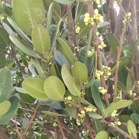 乔木,高可达20余米,小枝坚韧粗壮,具4-6稜。叶片厚革质,卵形,卵状长圆形或 椭圆形,稀圆形或披针形,长7-14(-20)厘米,宽3-6(-7)厘米,顶端钝、圆形或微凹,基部宽楔形至近圆形,上面深绿色,具光泽,下面黄绿色,中脉在下面隆起,侧脉纤细,微拱形,12-18对,两面隆起,至边缘处联结,网脉明显;叶柄粗壮,长6-15毫米。花杂性,同株,5数;雄花和雌花通常混合在-起,簇生或单生于落叶腋部,有时雌花成簇生状,雄花成假穗状,长约10厘米;雄花萼片近圆形,革质,边缘有密的短睫毛,内方2枚较大,外方3枚较小;花瓣倒卵形,黄色,长约为萼片的2倍多,雄蕊合生成5束,每束有6-10枚,束柄长约2毫米,花药双生;雌花通常具长梗,退化雄蕊合生成5束,花药萎缩状,副花冠上半部具不规则的啮齿;子房球形,外面有稜,3-5室,花柱极短,柱头盾形,5深裂,无瘤突。浆果宽长圆形,成熟时黄色,外面光滑,种子1-3(-4)枚。 [1-2]