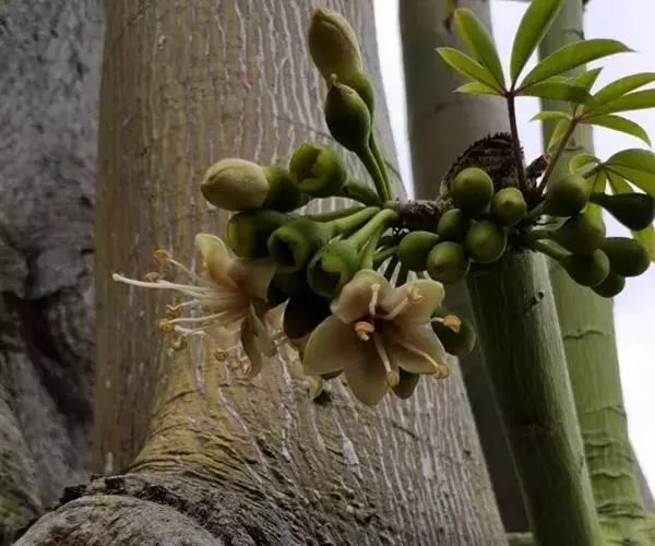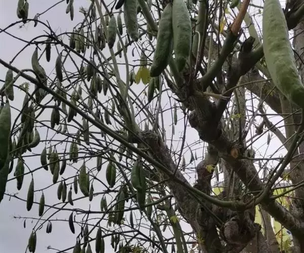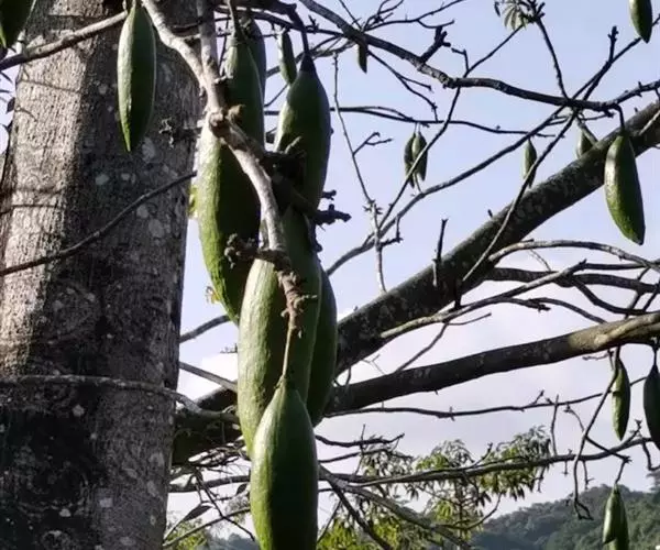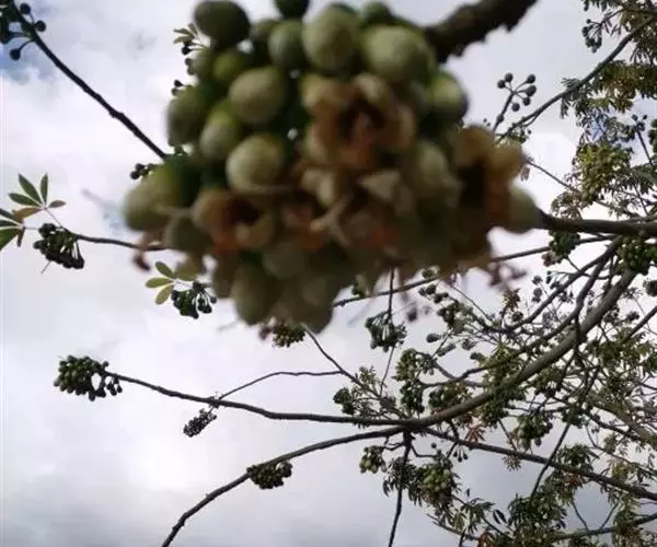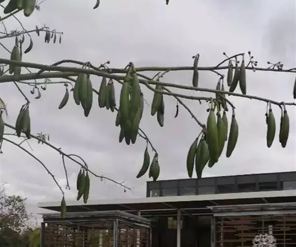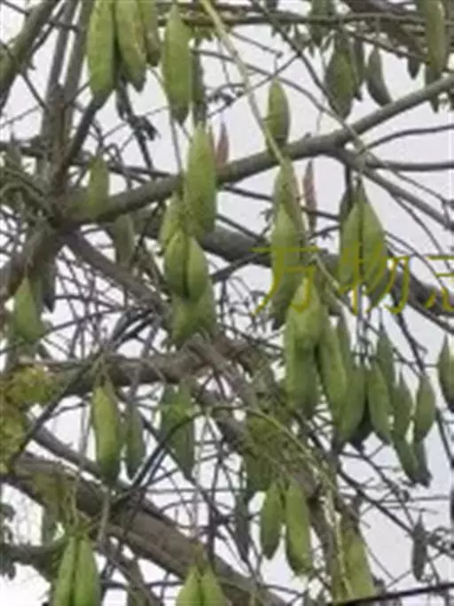 蒴果长圆形,向上渐狭,长7.5-15cm,粗3-5cm,果梗长7-25cm,5裂,果爿内面密生丝状绵毛,种子圆形,种皮革质、平滑。花期3-4月。