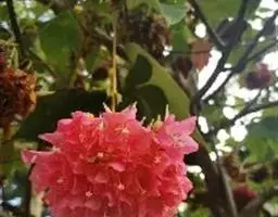 圆锥花序顶生或腋生,长4-8厘米,纤细,被银灰色的星状毛或鳞片状毛。花萼裂片5枚,镊合状排列,卵状披针形或长圆形,不等大,长约3毫米,宽约2毫米,两面密被星状毛或鳞片状毛;花瓣,枚,白色,有时为淡黄色或淡红色,芳香,长圆形或线状匙形,长约1厘米,宽约4毫米,外面密被毛,内面无毛;雄蕊15枚,花丝短,不等长,花药长圆形,药隔附属体短而钝;子房球形,密被短绒毛,花柱短,柱头头状,3裂。果实球形;增大的花萼裂片其中2枚较长,长3-4厘米,宽1-1.5厘米,先端圆形,具纵脉5条。