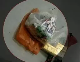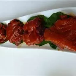 第五步,把煮熟的猪蹄捞出,装盘。再把花椒和干红辣椒用少许油煸至辣椒微黄,出锅淋在猪蹄上,再在其上撒上一些芝麻。