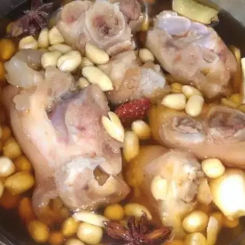 第四步,把大料、香叶、桂皮、葱、姜、蒜放入锅中一起炒,制出香味,然后放入料酒,加水,把焯好的猪蹄放入水中煮制,大约1个小时。在这个过程中,加入盐和味精,还要把制成的焦糖色不断地加入水中,使猪蹄上色。