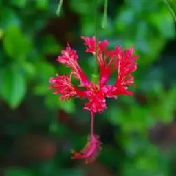 甜麻, 一年生草本,高约1米,茎红褐色,稍被淡黄色柔毛;枝细长,披散。叶卵形或阔卵形,长4.5-6.5厘米,宽3-4厘米,顶端短渐尖或急尖,基部圆形,两面均有稀疏的长粗毛,边缘有锯齿,近基部一对锯齿往往延伸成尾状的小裂片,基出脉5-7条;叶柄长0.9-1.6厘米,被淡黄色的长粗毛。花单独或数朵组成聚伞花序生于叶腋或腋外,花序柄或花柄均极短或近于无;萼片5片,狭窄长圆形,长约5毫米,上部半凹陷如舟状,顶端具角,外面紫红色;花瓣5片,与萼片近等长,倒卵形,黄色;雄蕊多数,长约3毫米,黄色;子房长圆柱形,被柔毛,花柱圆棒状,柱头如喙,5齿裂。蒴果长筒形,长约2.5厘米,直径约5毫米,具6条纵棱,其中3-4棱呈翅状突起,顶端有3-4条向外延伸的角,角二叉,成熟时3-4瓣裂,果瓣有浅横隔;种子多数。花期夏季。