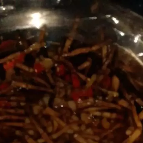 4、放油(适量),放葱头,爆炒至出香味。放入背干水的茶树菇,爆炒.