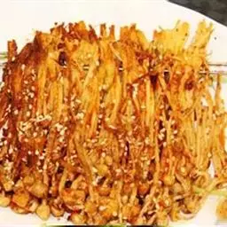 2、坐锅点火倒入油,待油热后放入拌好的茶树菇炸至金黄色捞出控油,锅中留少许底油,放入咸蛋黄加盐、白糖炒散,倒入炸好的茶树菇炒匀出锅即可。