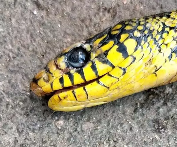 原色王锦蛇(大部分)头部有黑纹“王”字,多数体表呈黑黄白三色环纹,鳞间末多黄色,触摸有肌肉感且粗糙紧实。多有后1/3无纹路呈星点至尾尖。