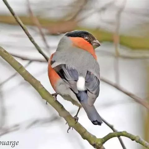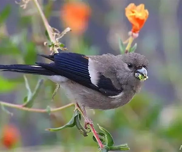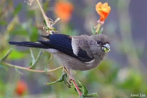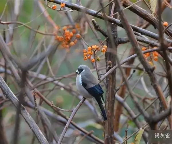 褐灰雀(学名:Pyrrhula nipalensis):小型鸟类,体长16-17厘米。上下体羽灰褐色,头顶各羽中央较暗,形成鳞状斑,眼先、眼周和嘴基黑褐色,眼下有一白斑。腰白色,两翅和尾黑色,最内侧一枚飞羽外翈羽缘赤红色。雌鸟和雄鸟相似,但最内侧一枚飞羽外翈为草黄色而不为赤红色。特征明显,野外容易识别。