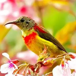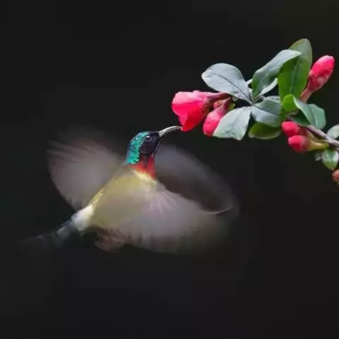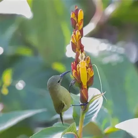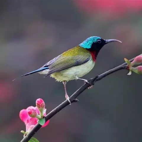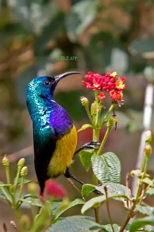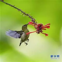 叉尾太阳鸟,雀形目太阳鸟科太阳鸟属留鸟;为小型鸟类,雄鸟头顶辉蓝绿色,上体橄榄绿色,腰明黄色,…