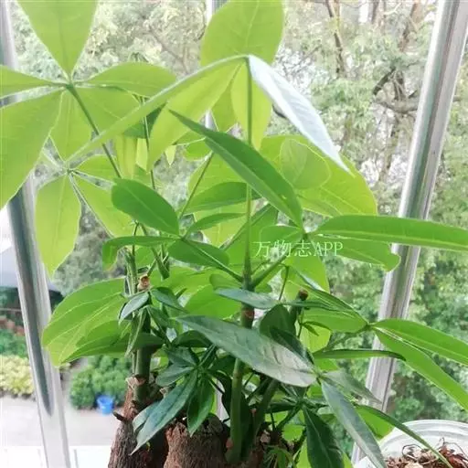 瓜栗(学名:Pachira macrocarpa (Cham. et Schlecht.) Walp. ),俗称发财树,木棉科小乔木,高4-5米,树冠较松散,幼枝栗褐色,无毛。小叶具短柄或近无柄。花单生枝顶叶腋;花梗粗壮,被黄色星状茸毛,脱落;萼杯状,近革质;花瓣淡黄绿色,狭披针形至线形,上半部反卷;雄蕊管较短,花丝连雄蕊管长13-15厘米,下部黄色,向上变红色,花药狭线形,弧曲;花柱长于雄蕊,深红色。蒴果近梨形,果皮厚,木质,几黄褐色,外面无毛,内面密被长绵毛,开裂,每室种子多数。种子大,不规则的梯状楔形,表皮暗褐色,有白色螺纹,内含多胚。花期5-11月,果先后成熟,种子落地后自然萌发。