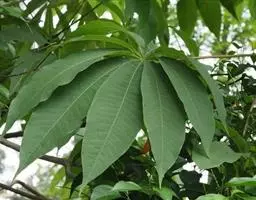小叶5-11,具短柄或近无柄,长圆形至倒卵状长圆形,渐尖,基部楔形,全缘,上面无毛,背面及叶柄被锈色星状茸毛;中央小叶长13-24厘米,宽4.5-8厘米,外侧小叶渐小;中肋表面平坦,背面强烈隆起,侧脉16-20对,几平伸,至边缘附近连结为一圈波状集合脉,其间网脉细密,均于背面隆起;叶柄长11-15厘米。