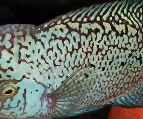 2.穿孔病:该病主要是由柱状纤维黏细菌引起,传染性强。患病罗汉鱼开始时食欲减退,体表鳞片脱落,并且表皮显现微红色;后期出现岀血性溃疡症状;如果病情继续恶化,则鱼体体表开孔,孔里面的肉充血、腐烂。鱼体发病部位大多在体侧、背部和尾柄,有时鳃盖也会发生病变,严重的时候甚至腐烂至鱼骨。后期即使病鱼痊愈,也难恢复原状,致使欣赏价值降低。