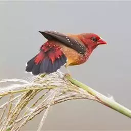 红梅花雀小型鸟类,体长9-10厘米。雄鸟通体朱红色,背、肩、胸等满布白色小斑点,…