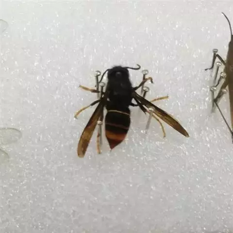 金环胡蜂是胡蜂科、胡蜂属昆虫。雌蜂体长约40毫米,工蜂体长25毫米,雌蜂体黑褐色,头部橙黄色,…