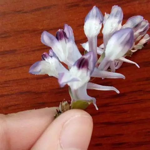总状花序顶生和腋生,长5-9厘米,果时达15厘米,有(5-)13-20花,排列稀疏;苞片狭卵形至披针形,全缘,有时基部者3浅裂;花梗劲直,长约为苞片1/2。萼片鳞片状,近肾形,长约1毫米,边缘具缺刻状齿。花瓣黄色,上花瓣长1.8-2厘米,花瓣片舟状卵形,先端渐尖,背部鸡冠状突起高1-1.5毫米,超出瓣片先端并延伸至其中部。距圆筒形,与花瓣片近等长或稍长,末端略下弯,下花瓣长1-1.2厘米,鸡冠同上瓣,中部稍缢缩,下部成浅囊状,内花瓣长8-9毫米,花瓣片倒卵形,具1侧生囊,爪线形,略长于花瓣片;雄蕊束长7-8毫米,花药小,长圆形,花丝披针形,蜜腺体贯穿距的2/5-1/2;子房狭椭圆形,长4-5毫米,具1列胚珠,花柱细,与子房近等长。柱头扁长方形,上端具4乳突。