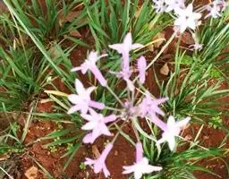 紫娇花 鳞茎肥厚,呈球形,直径达2厘米,具白色膜质叶鞘。叶多为半圆柱形,中央稍空,长约30厘米,宽约5毫米,叶鞘长5-20厘米。