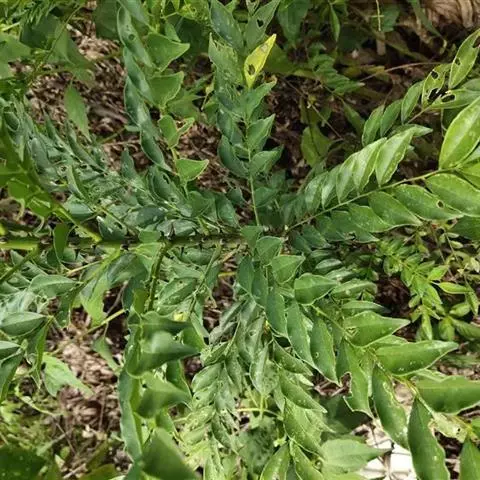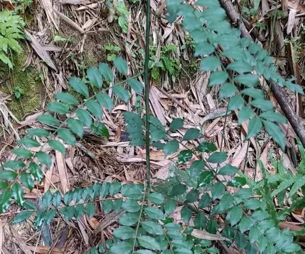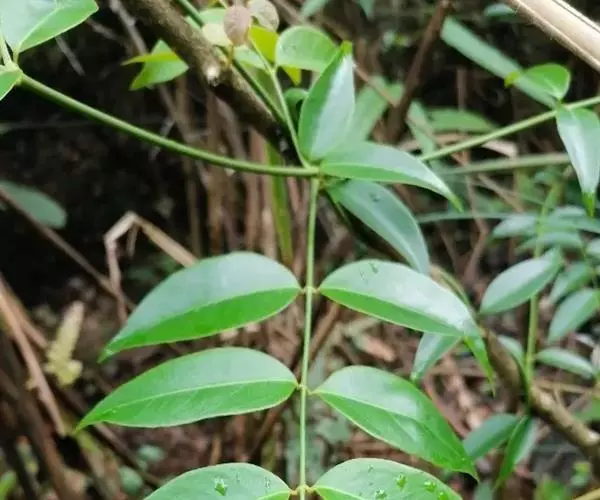 幼龄植株呈直立灌木状,其小枝细长而披垂,成龄植株攀援于它树上,枝干有短沟刺,叶轴上的刺较多。叶有小叶5—25片,近花序的叶有小叶较少,萌发枝上的叶有小叶较多;小叶互生或位于叶轴上部的对生,卵形,卵状椭圆形或斜长圆形,长4—10厘米,宽1.5—4厘米,稀较小,顶部短尖至长尾状尖,或突急尖至长渐尖,顶端常钝头且微凹缺,凹口处有一油点,基部短尖或宽楔形,或一侧近于圆,另一侧楔尖,两侧明显不对称或近于对称,全缘或叶缘的上半段有细裂齿,干后乌黑或黑褐色,叶面有光泽或老叶暗淡无光,中脉至少下半段凹陷且无毛,或有灰色粉末状微柔毛,则中脉近于平坦且叶有小叶较少,通常5—11片,质地也较厚而稍硬,油点不显,或少且小,仅在扩大镜下可见。花序腋生或兼有顶生;萼片及花瓣均4片;萼片淡紫绿色,宽卵形,长约1/2毫米;花瓣淡黄绿色,长2—3毫米;雄花的雄蕊4枚,长3—4毫米,药隔顶部有1油点;退化雌蕊半圆形垫状凸起,花柱2—4裂;雌花有心皮4或3个;退化雄蕊鳞片状。分果瓣紫红色,干后灰褐色或乌黑色,径4.5—55毫米,顶端有短芒尖,油点通常不甚明显,平或稍凸起,有时凹陷;种子近圆球形,两端微尖,径4—5毫米。花期3—5月,果期7—8月。