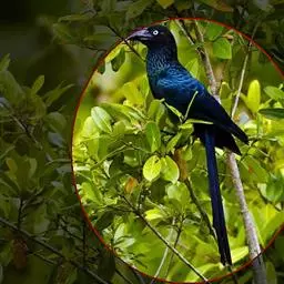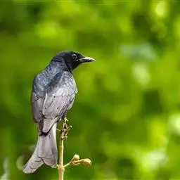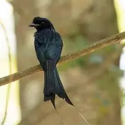 发冠卷尾是中型鸟类,体长28-35厘米。通体绒黑色缀蓝绿色金属光泽,额部具发丝状羽冠,…